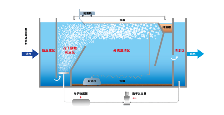 孢子轉移技術,是將混凝技術、氣浮技術與微納米孢子相結合,通過定制化藥劑、微納米氣泡與水中的磷、疏水基懸浮物發(fā)生反應,創新形成的一種高效物理化學處理方法。主要解決了目前常用溶氣氣浮技術在應用過程中存在的處理效率較差、表面負荷較低、處理能耗較高、應急機動性不強等問題。